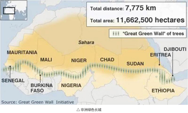 “非洲綠色長城”是2007年經(jīng)非洲聯(lián)盟決議的一項泛非植被屏障倡議,涵蓋了撒哈拉沙漠北部和南部所有的干旱與半干旱區(qū),核心區(qū)域面積為7.8億公頃,涉及2.32億人口,現(xiàn)已成為非洲經(jīng)濟社會的“綠色屏障”,被稱之為“非洲準(zhǔn)備面對未來的象征”。