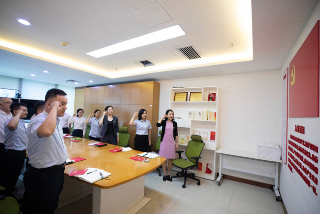 “我志愿加入中國共產(chǎn)黨……隨時準備為黨和人民犧牲一切,永不叛黨。”在公司黨委委員、紀委書記廖紅梅的帶領(lǐng)下,13位公司本部黨員代表列隊肅立,高舉右拳,面對鮮紅的黨旗重溫入黨誓詞,再次莊嚴宣誓,鏗鏘誓詞,強烈震撼著在場每一位黨員;錚錚誓言,充分激發(fā)奮斗初心使命,升華黨員覺悟,進一步堅定了對黨的赤膽忠心和為共產(chǎn)主義事業(yè)奮斗終身的強烈決心。