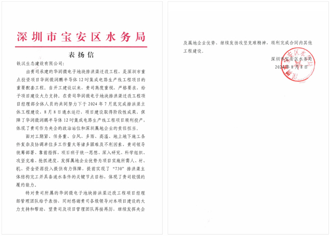寶安區(qū)水務(wù)局《表揚信》指出,自項目開工建設(shè)以來,鐵漢建設(shè)高度重視、嚴格要求,給予項目建設(shè)大力支持。期間,面對工期緊、任務(wù)重,臺風、多雨、高溫、地上地下施工條件復雜及協(xié)調(diào)單位多、工作量大等諸多困難及不利因素,鐵漢建設(shè)統(tǒng)籌部署、靠前指揮,項目班子科學組織、攻堅克難、搶抓進度,發(fā)揮屬地企業(yè)優(yōu)勢為項目實施所需人、材、機、資金資源投入提供有力保障,提前實現(xiàn)了“730”排洪渠主體結(jié)構(gòu)完工并具備通水條件的關(guān)鍵節(jié)點目標,體現(xiàn)了較強的履約能力。8月8日,項目順利通水運行,保障了華潤微潤鵬半導體12吋集成電路生產(chǎn)線工程項目順利投產(chǎn),體現(xiàn)了作為央企的政治站位和深圳屬地企業(yè)的責任擔當。