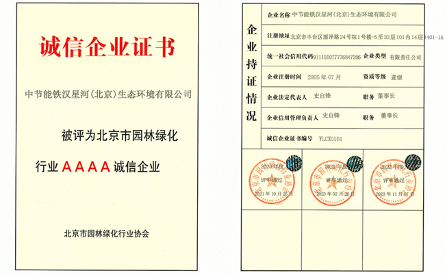 鐵漢星河連續(xù)九年獲評(píng)北京市園林綠化行業(yè)“4A誠信企業(yè)”